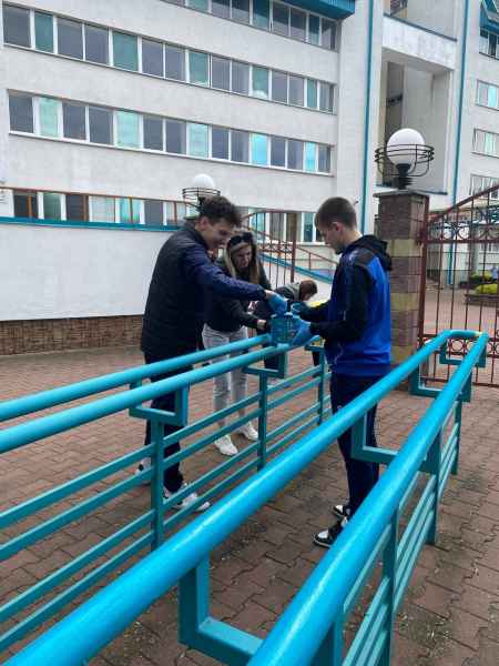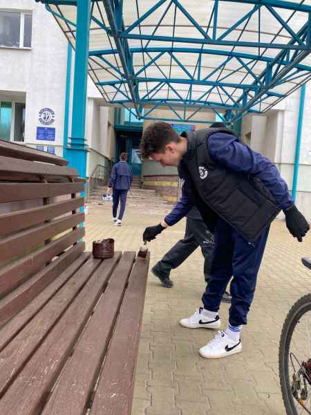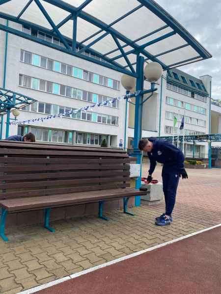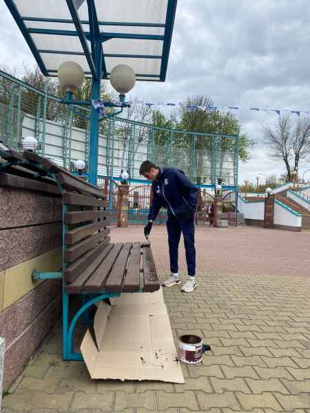Игроки занимались облагораживанием территории спортивного комплекса. В частности, покраской скамеек, перил у входа, а также уборкой.